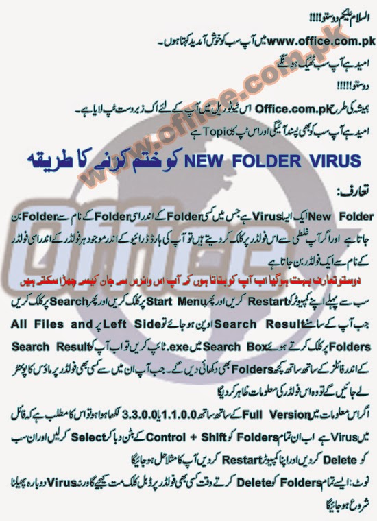 Welcome to our Office. A largest hub of a lot of things, including Video Lectures, Video Tutorials, Tips and Tricks, Notes and too many other things which help you a lot in increasing your Skills. Today I have brought a very special and a very useful trick and tip for all of you. Yes, a very useful tip 🙂 . A lot of people around the world have been teased by the viruses, specially from the Shortcut Virus. This virus is nowadays spread all over the world, when we search over the internet, we came to know that everyone is complaining regarding the same problem and asking for help regarding the removal of such kind of viruses from their computer. My today’s tutorial is regarding the same topic in Urdu language. I hope the below mentioned points will really help you in improving your PC performance and you will be in peace after removing those sticky viruses. So here we go…..
